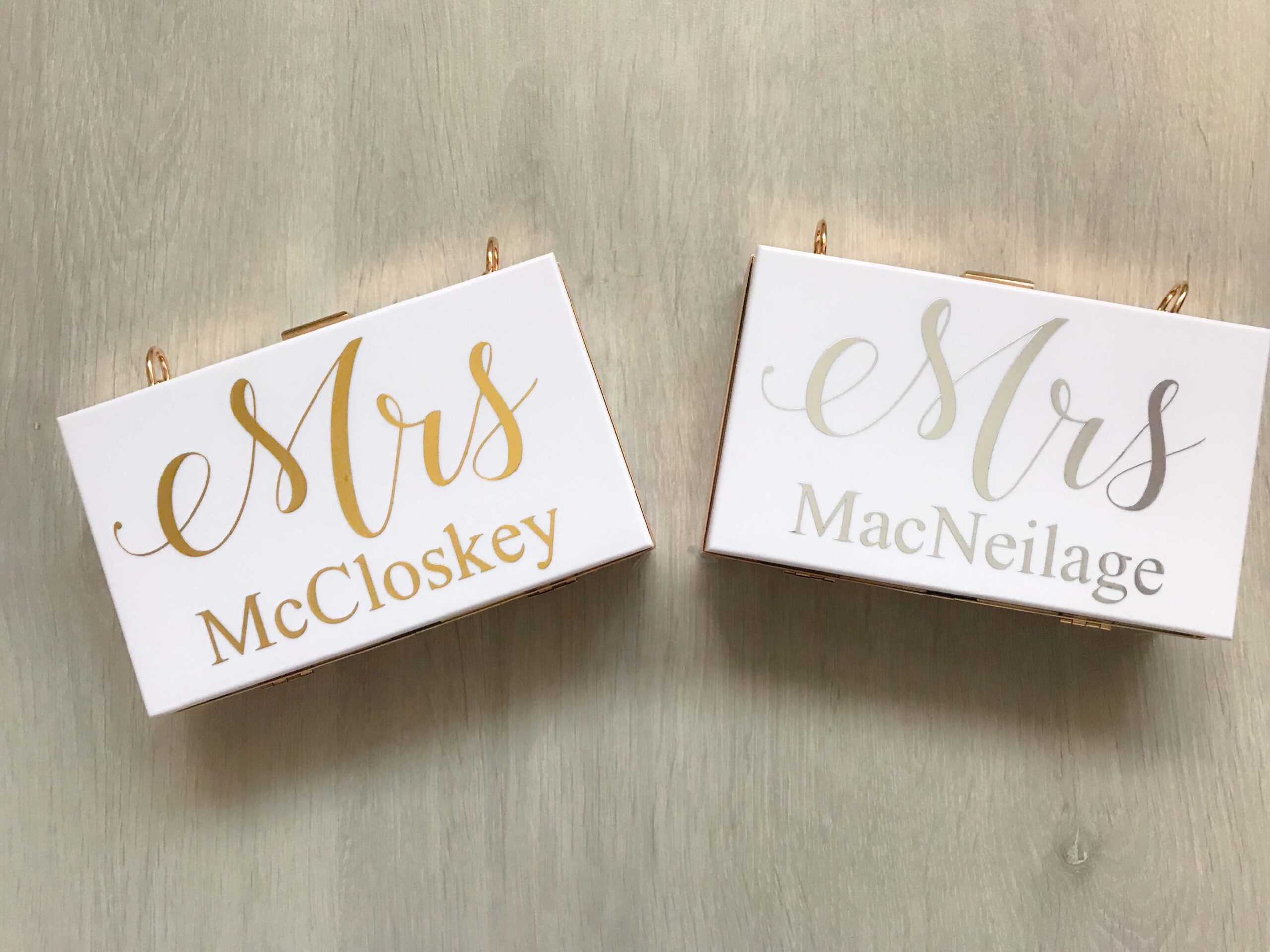 mrs personalised white and gold clutch bag