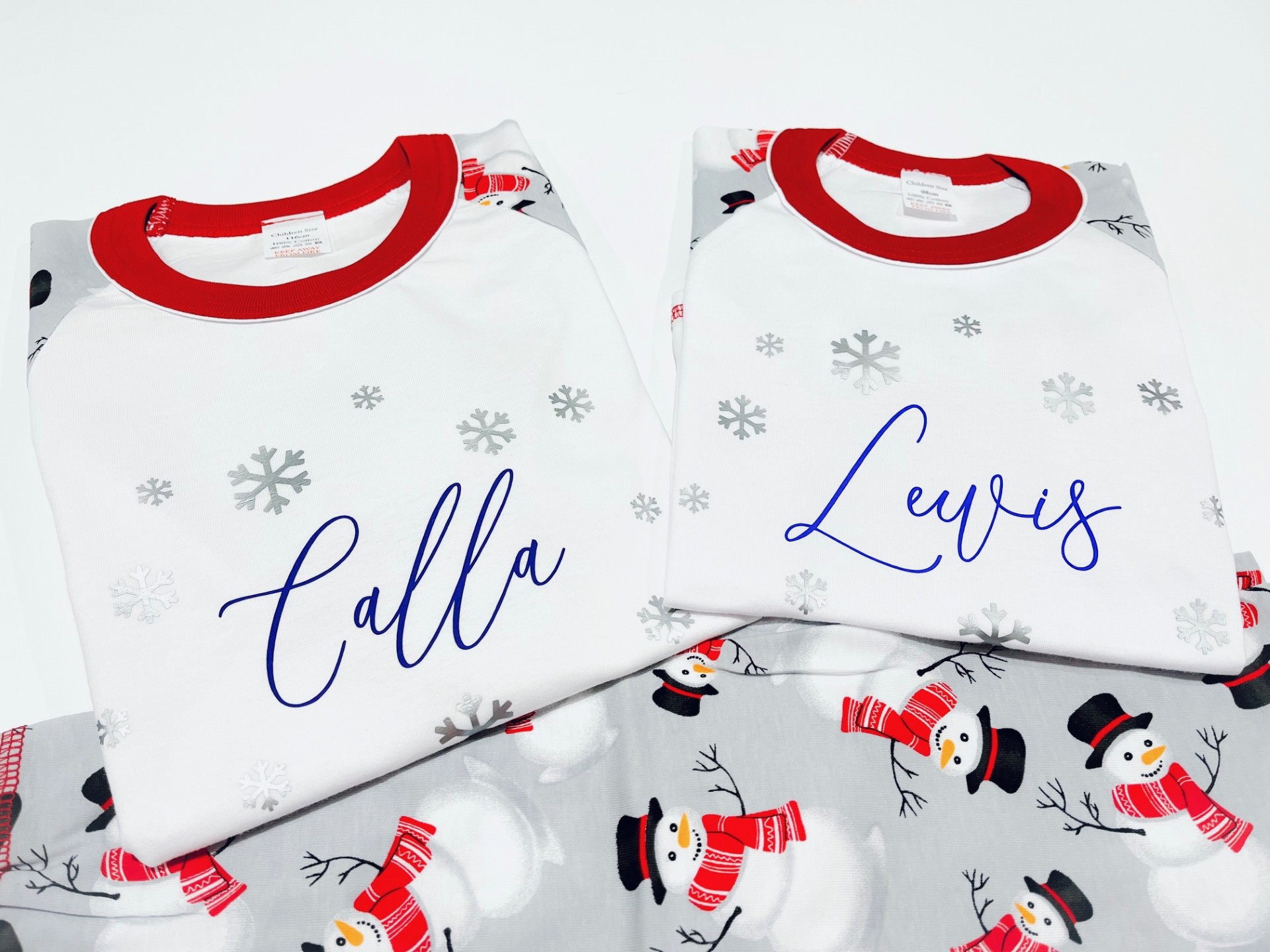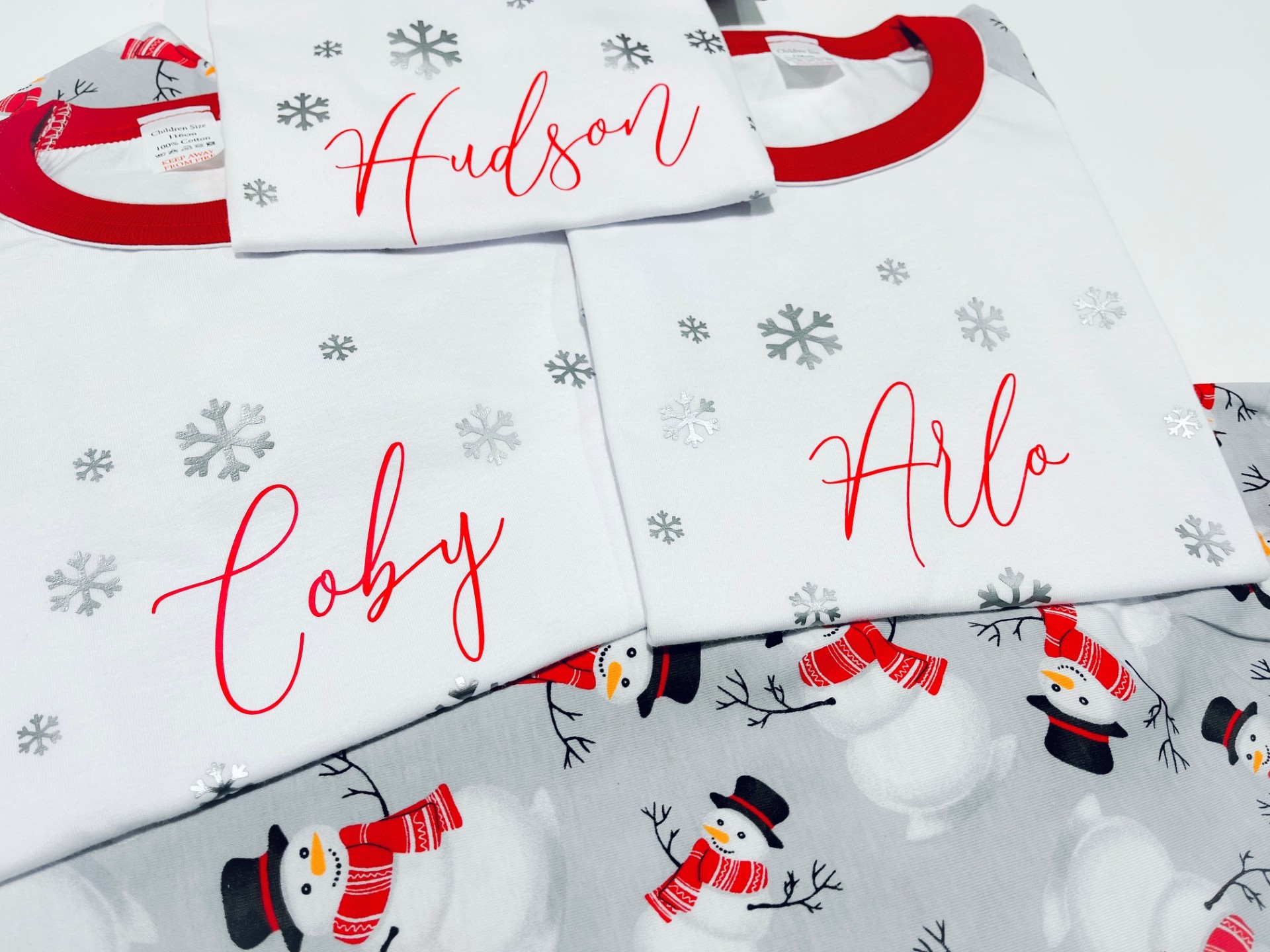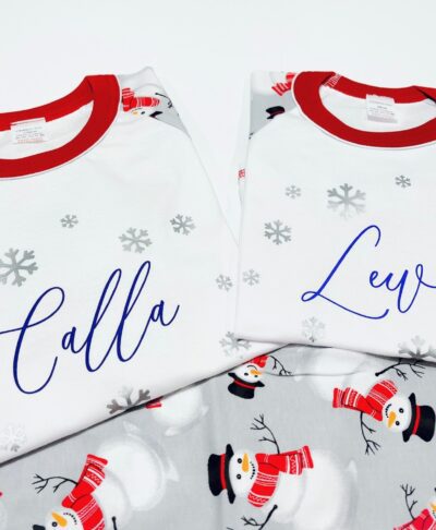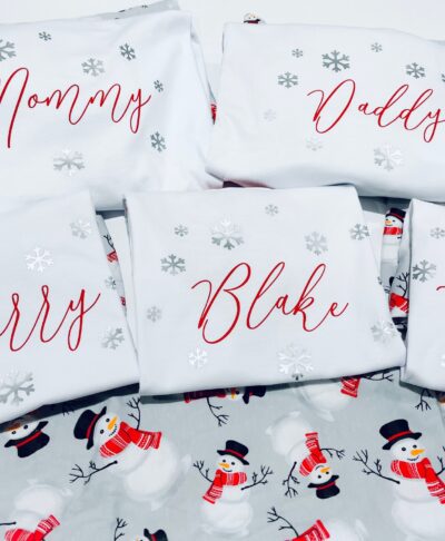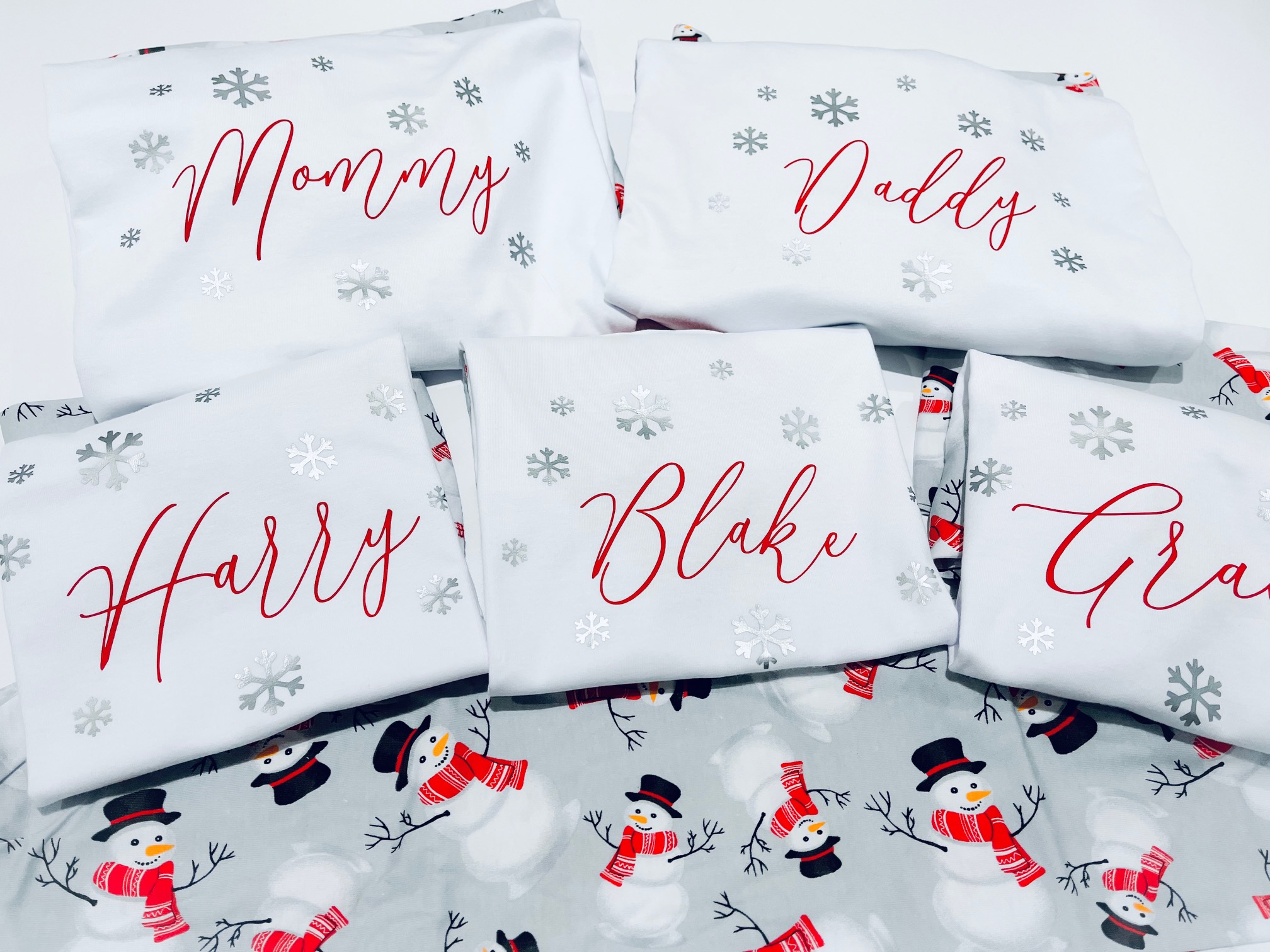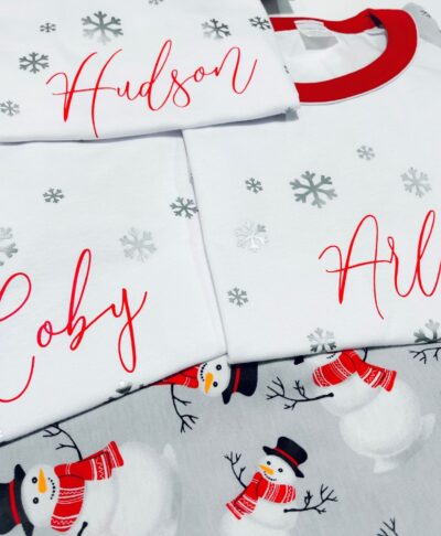 Made from super-soft 100% cotton, each set features a charming snowman print with classic red and white accents – ideal for Christmas Eve, holiday photos, or relaxing on Christmas morning. The top is personalised with your chosen name (e.g. Mommy, Daddy, Harry, etc.) in elegant red script, surrounded by delicate metalic snowflakes for a magical winter feel.