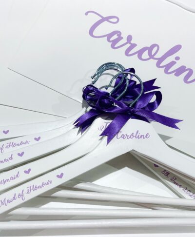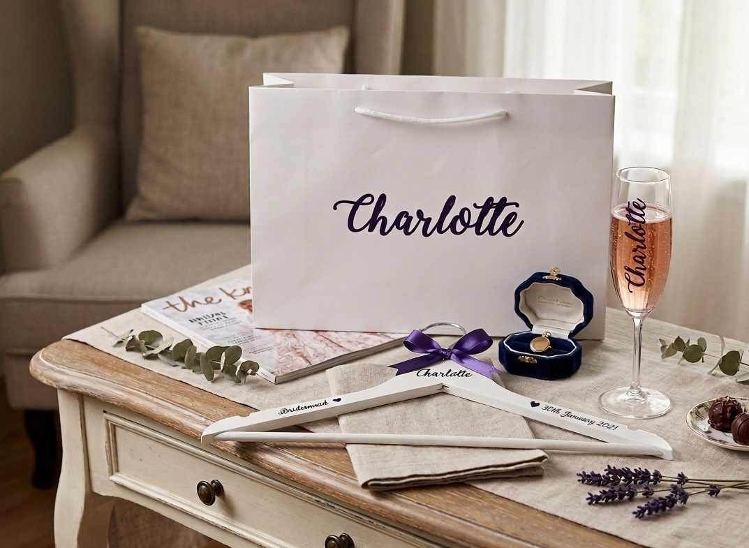 Each luxury set includes a selection of elegant treats; our personalised hanger and a personalised champagne glass carefully packaged with a keepsake large gloss gift bag personalised with your bridesmaid’s name, wedding role, and your wedding date. From chic accessories to pampering extras, this gift set is designed to make your bridesmaids feel truly special.