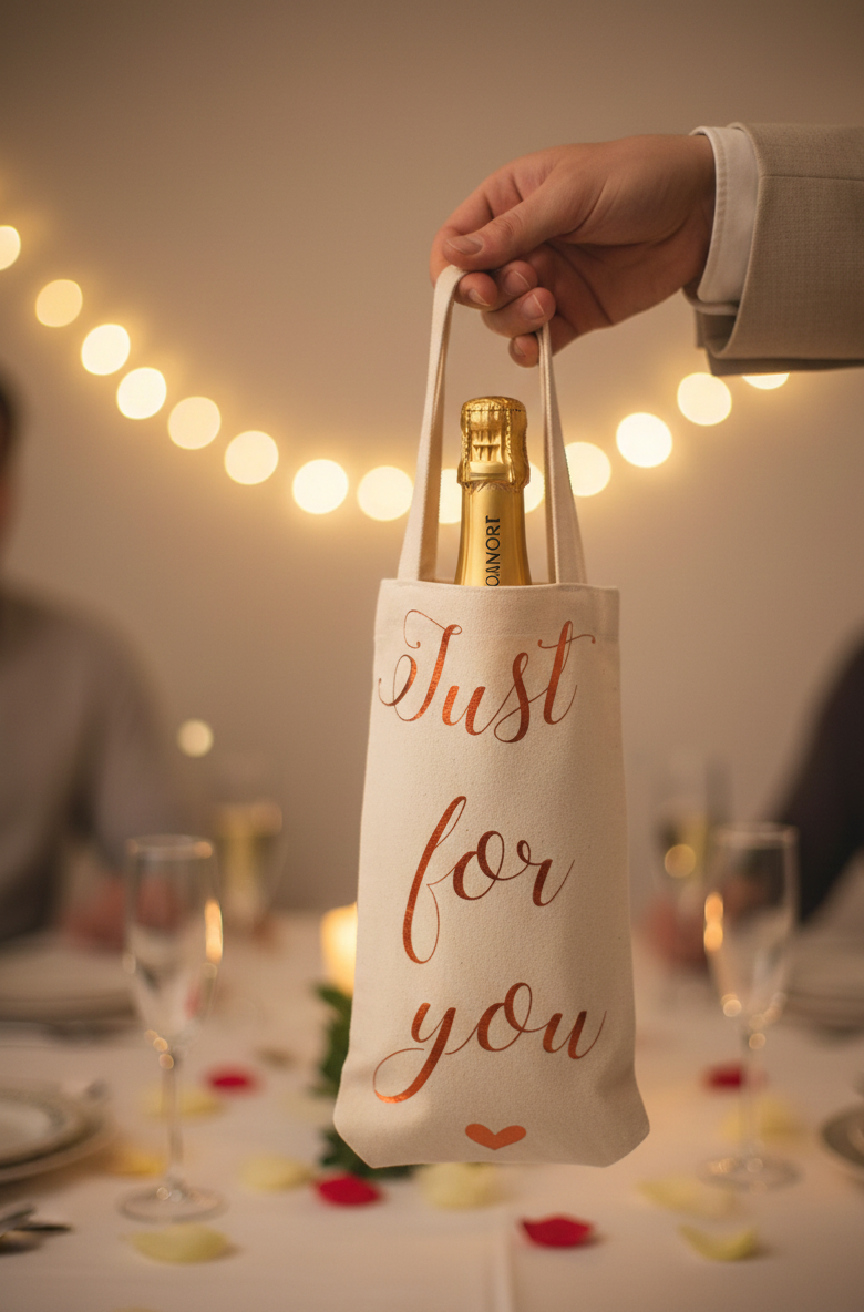 A hand wearing a suit jacket sleeve is holding up a canvas wine bottle bag containing a bottle of champagne. The bag is cream colored with copper foil script that reads "Just for you" and a small heart at the bottom. The background shows a dimly lit formal dinner table with champagne flutes, scattered rose petals, a lit candle, and blurred figures of people seated, suggesting a celebration or romantic setting.