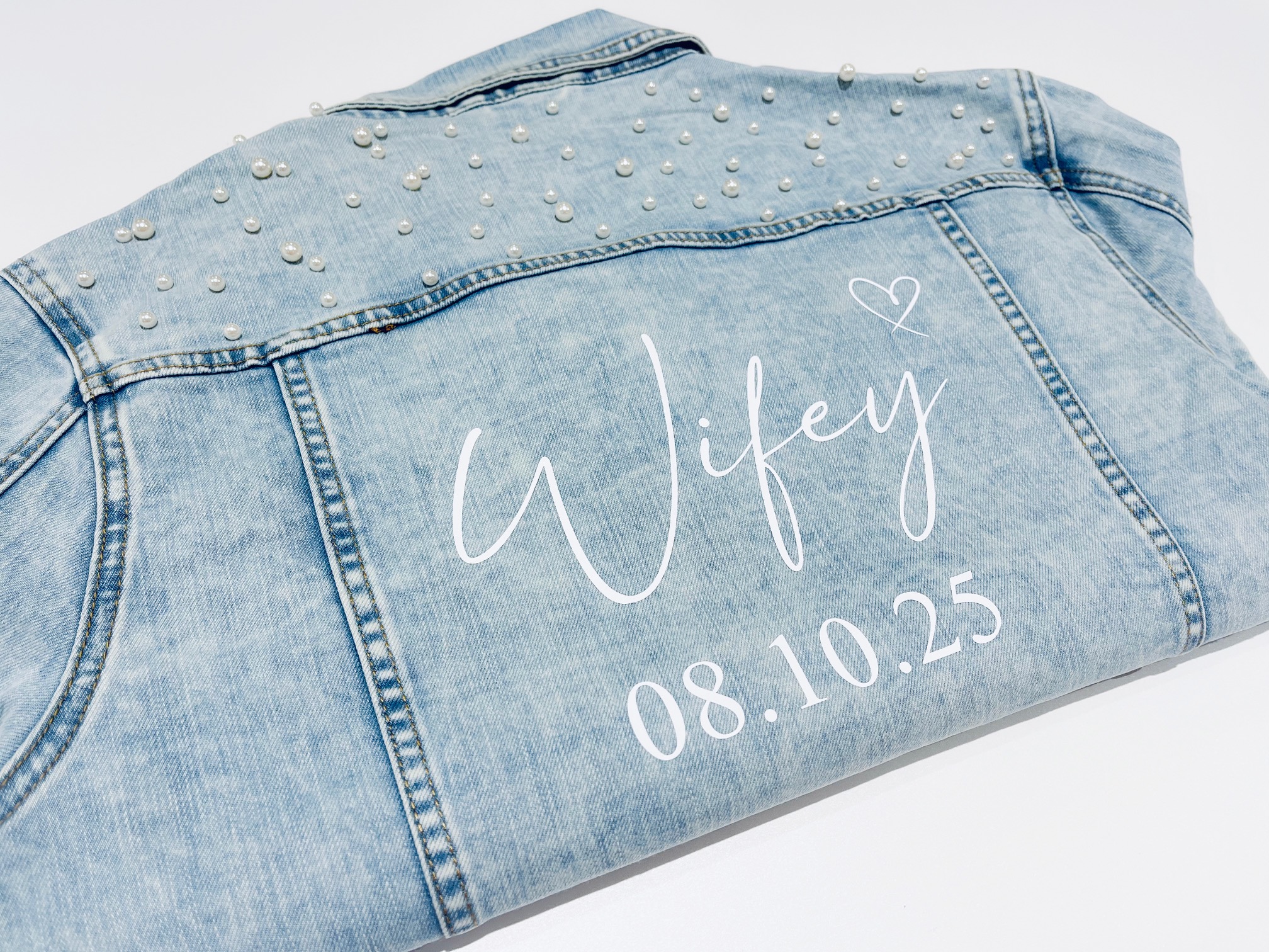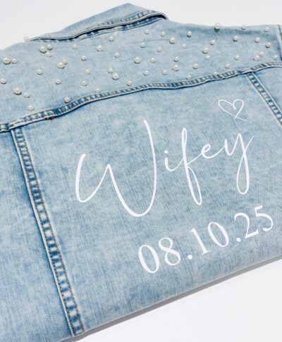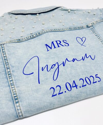 Get ready to say “I do” in denim! Order your Personalised Mrs Pearl Denim Jacket today and make your walk down the aisle even more memorable.