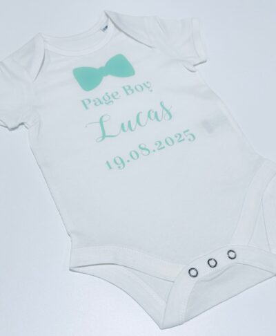 Make your page boy stand out in style with this customised wedding baby grow – designed to celebrate love, family, and special memories.