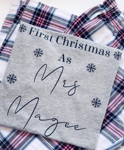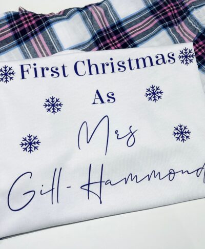 Each set features a soft cotton short sleeved top personalised with your new married name alongside festive snowflake details, paired with check long pyjama bottoms for a timeless seasonal look.