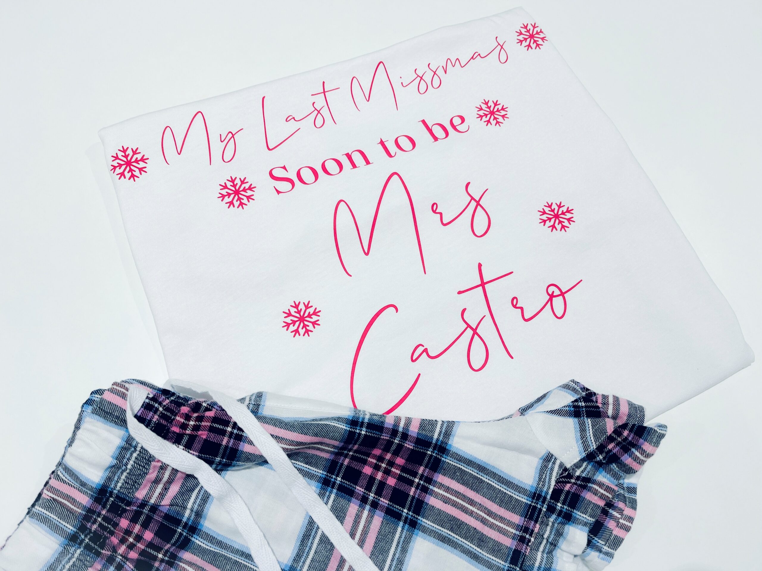 The soft short sleeved top is beautifully personalised with your new married name and festive snowflake details, while the coordinating checked shorts add a fun and relaxed touch. Ideal for warmer nights or those who prefer a lighter festive sleepwear option.