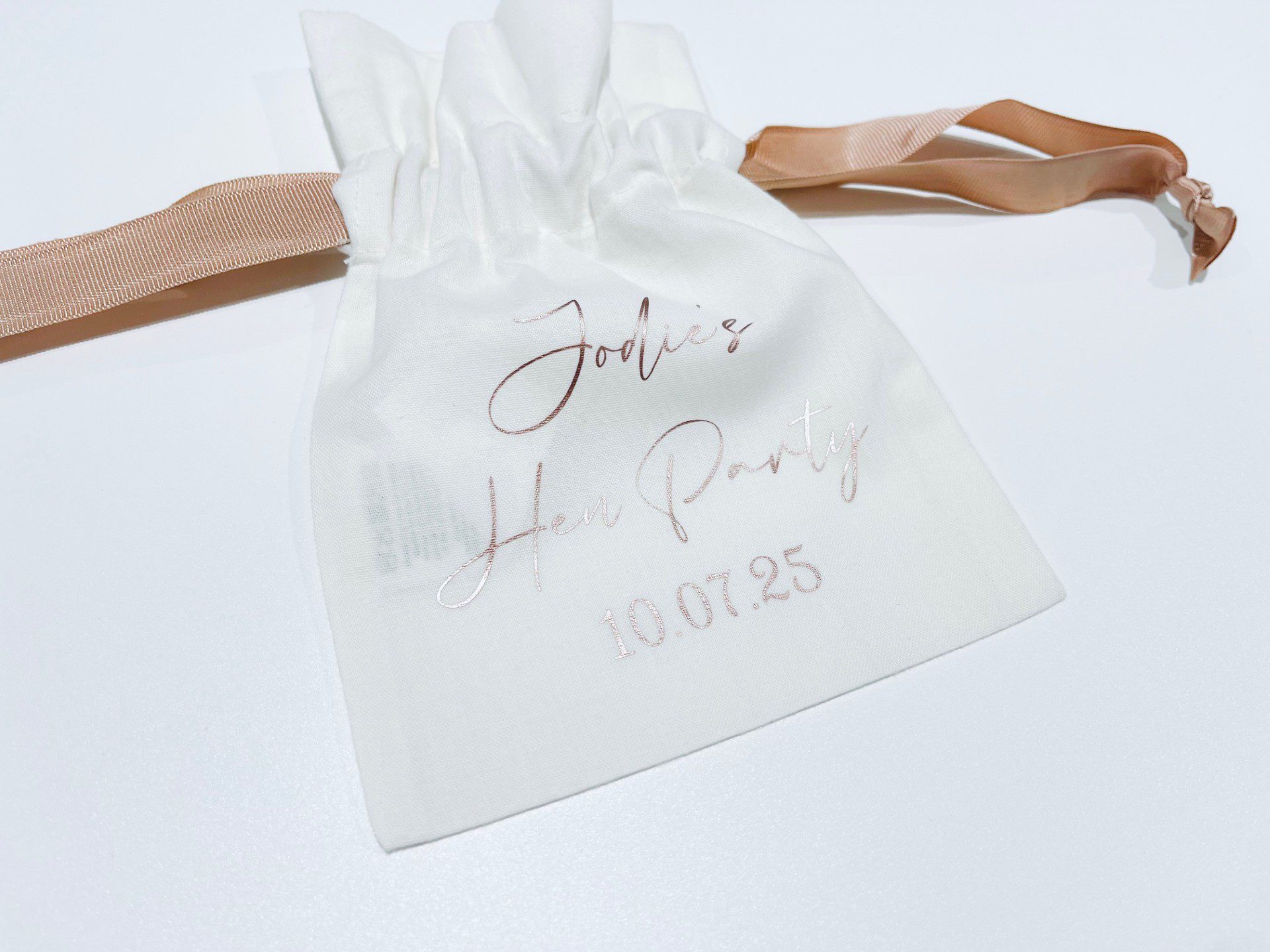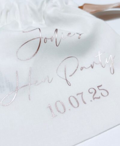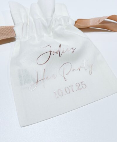 Crafted from luxurious white fabric with a satin finish, each pouch features a personalised design with the bride’s name and event date in gorgeous rose gold lettering, making it an unforgettable accessory for the celebration.